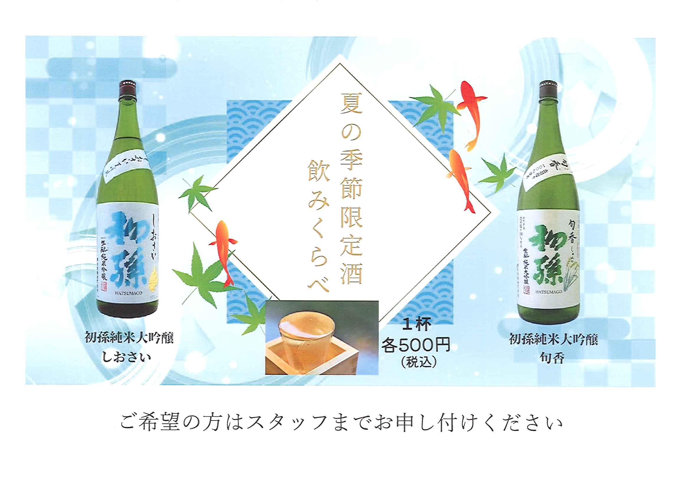 庄内空港ターミナルビル2階搭乗待合室内有料待合室「to plads」にて、 夏季限定酒「初孫 純米大吟醸 旬香」「初孫 純米大吟醸 しおさい」の飲み比べと庄内特産「殿様のだだちゃ豆」の販売を行っております。 「to plads」は山形県の新型コロナ対策認証店で、営業時間はANA398便(庄内発12:50)及びANA400便(庄内発17:45)に合わせ営業しております。 航空機ご利用のお客様は、ぜひお早めに搭乗手続きをお済ませのうえ、「to plads」にて出発までの間、ごゆっくりお過ごしくださいませ。 なお、ご試飲、ご試食のうえ、購入希望の方は当社ショッピングサイト「庄内くう港」でも販売しております。 また、数量限定ですので、売り切れの際は予めご了承ください。◎庄内空港ビルホームページはこちら>>