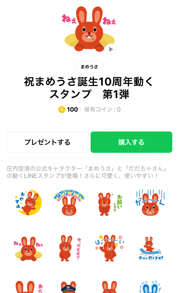 お知らせ - キャンペーン - お知らせ - プレスリリース - ショップ 当社マスコットキャラクター「まめうさ」LINE動くスタンプ販売のお知らせ 当社マスコットキャラクター「まめうさ」は今年7月でデビュー10周年を迎えました。 それを記念し、「祝まめうさ誕生10周年動くスタンプ第1弾」をLINEスタンプショップにて販売しております。 庄内出身の方、庄内にゆかりのある方、まめうさファンの方、ぜひぜひLINEスタンプでおいしい庄内空港&まめうさのPRをお願いいたします! ◎詳しくはLINEスタンプショップにて「まめうさ」で検索!