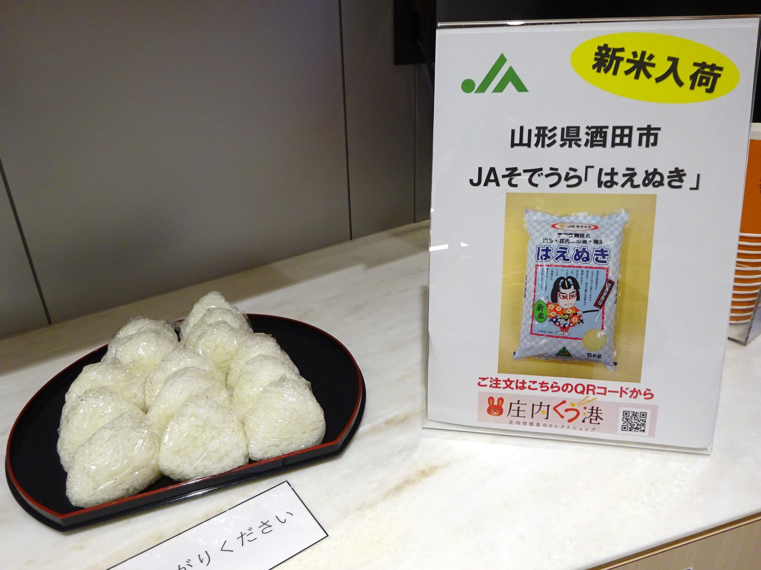 おいしい庄内空港2階搭乗待合室内カードラウンジ「to plads」では、サービスの一環として、現在新米おにぎりを提供をしております。 先日は新米!炊き立て!の「はえぬき」の塩おにぎりを提供し、多くのお客様より「おいしい」「新米が食べられて嬉しい」と好評でした。 おにぎりは平日限定、数量限定で提供しております。来週からは「つや姫」の予定です。なお、サービス品が変更になる場合もございます。予めご了承ください。また、現在当社ショッピングサイト「庄内くう港」で新米送料無料キャンペーンを実施しており、カードラウンジで提供している「はえぬき」「つや姫」等お得にご購入いただけます。 詳しくは下記ショッピングサイトURLをクリックしてください。