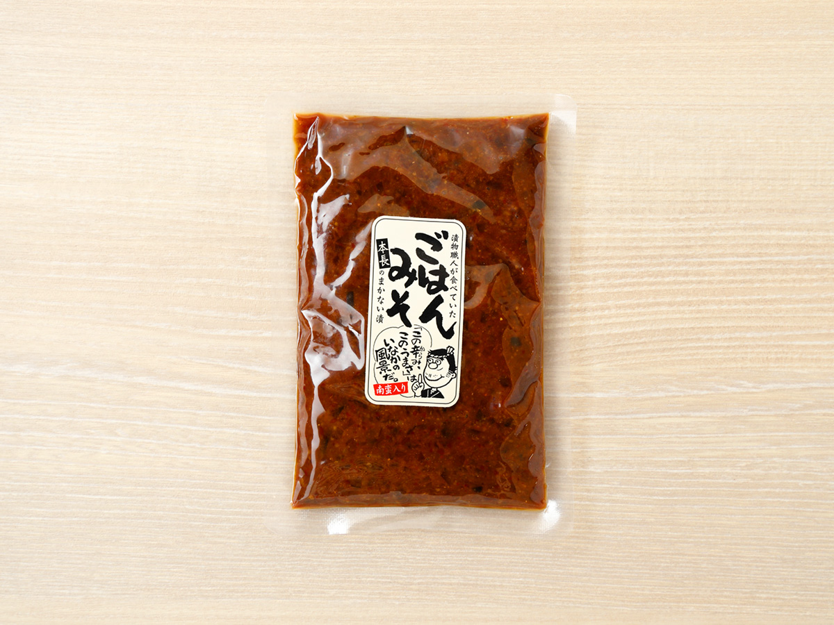 山形県鶴岡市の老舗漬物屋「本長」の人気商品「ごはんみそ」。 シャキシャキした食感と濃厚な味噌の風味が温かいごはんによく合います。 南蛮入りでごはんが進むこと間違いなしの一品です。